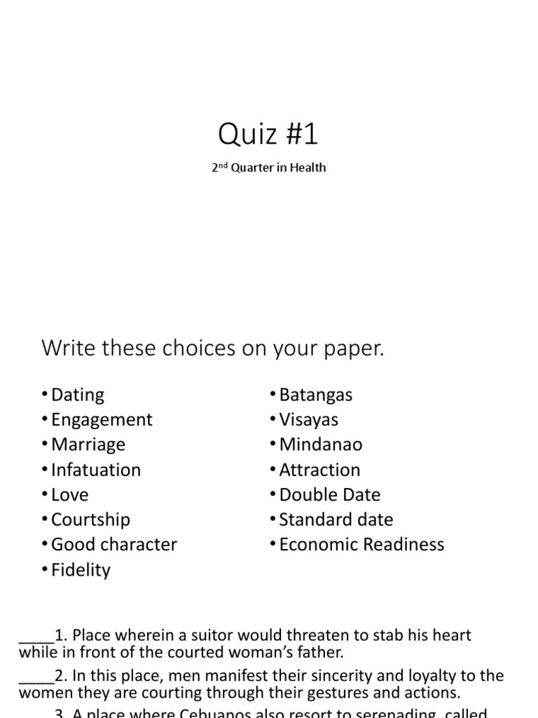 Quiz 1 Health 2q from imgv2-1-f.scribdassets.com A young man and a young woman on a date are responsible to help each other maintain their standards and to protect each other's honor and virtue. Well, that mystery is just about to be solved. Animal courtship may involve complicated dances or touching, vocalizations, or displays of beauty or fighting prowess. Is one better than the other? The main difference is what is to be achieved from it. Parents will hire a matchmaker to provide. Some religious communities still keep to. This stage of dating requires much intentionality.